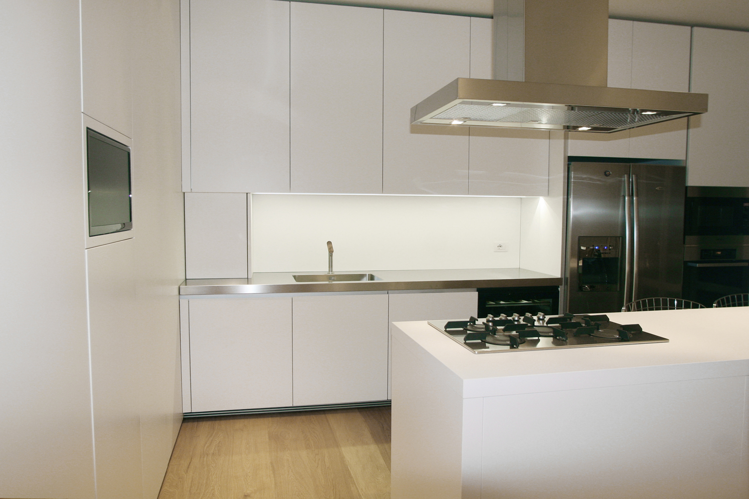 I materiali ed i colori sono volutamente ripetuti in tutta la casa. Il color bianco latte è dominante in tutti gli ambienti: utilizzato con finitura a smalto nel living, cucina, bagni e per tutte le porte rasomuro, come normale pittura lavabile nelle camere, come laccatura degli arredi realizzati su disegno e come resina applicata sia alle pareti delle docce sia come finitura del lavabo su disegno del bagno padronale, conferisce luminosità ed omogeneità all’abitazione. Il pavimento è in legno di rovere con posa “a giunti allineati” che aumenta la linearità e il rigore stilistico dell’ appartamento. A fare da contrasto cromatico alla tonalità bianco latte ed al legno di rovere (di cui peraltro riprende il colore nelle venature ferrose) è il marmo nero Saint Laurent, utilizzato nella lunga base monolitica che contiene il camino nella zona giorno ed in entrambi i bagni.