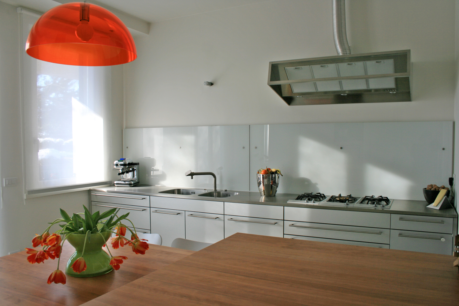 Il punto di partenza è stata la ridefinizione della zona cucina, nata dall’accorpamento del preesistente tinello e cucinino. La nuova cucina affaccia sul lungo corridoio di collegamento tra ingresso e zona living mediante due porte a tutt’altezza in vetro trasparente. L’obiettivo progettuale era quello di aumentare la luminosità e la fluidità degli ambienti.