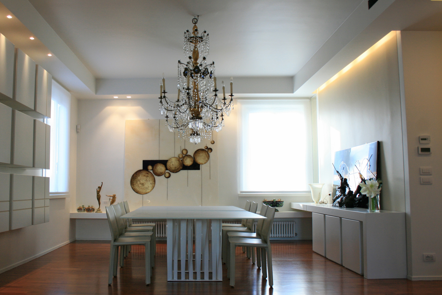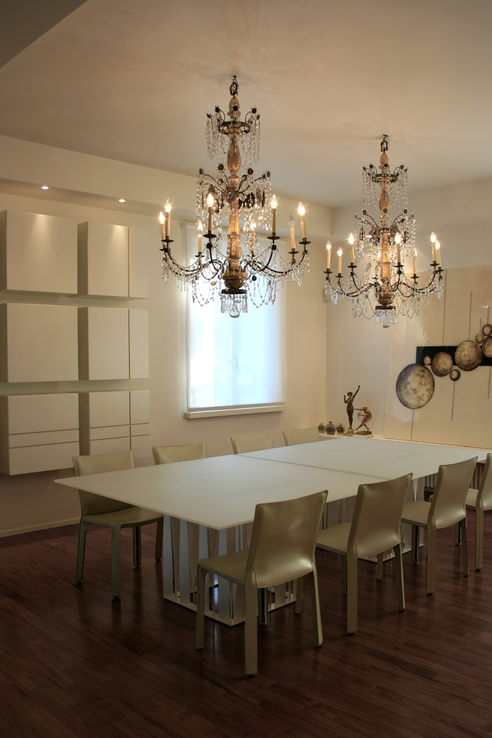 La zona pranzo, adiacente la cucina, è inserita nello spazio precedentemente occupato dallo studio e direttamente collegata all’area salotto. La necessità di poter ricollocare due importanti lampadari genovesi del ‘600 (precedentemente ubicati in due stanze separate) ha condotto ad una soluzione basata sui contrasti e sulla duplicità. Abbiamo deciso infatti di affiancare i due grandi lampadari e di abbinare due grandi tavoli di design contemporaneo (Boboli di Cassina). Gli arredi contenitivi posti sulle pareti laterali sono realizzati su disegno; elementi modulari in legno laccato bianco sono sospesi a parete o divengono basi a pavimento. Una lunga mensola realizzata in cartongesso finita a resina bianca collega la zona pranzo con la cucina.