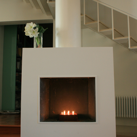Nell’area divani le modifiche sostanziali hanno riguardato il camino e la scala di collegamento al piano superiore. Il camino esistente è stato demolito e ricostruito. Il nuovo camino è un parallelepipedo bianco con cappa a sezione circolare. La scala è stata semplicemente riverniciata con smalto bianco. Anche il bagno della zona giorno è stato completamente ridisegnato: una lunga mensola in legno laccato con sottostanti moduli in teak serve da appoggio al lavabo, mentre due elementi sospesi hanno la funzione di contenimento. Molta importanza è stata data all’illuminazione. Vari tipi di corpi illuminanti, alogeni, fluorescenti ed ad incandescenza scandiscono i percorsi e gli utilizzi delle singole stanze. La pavimentazione in legno Doussiè è stata mantenuta; le pavimentazioni di cucina, bagno e scala di collegamento alla zona notte sono state realizzate in resina color sabbia. Le pareti ed i soffitti sono stati finiti con smalto satinato.