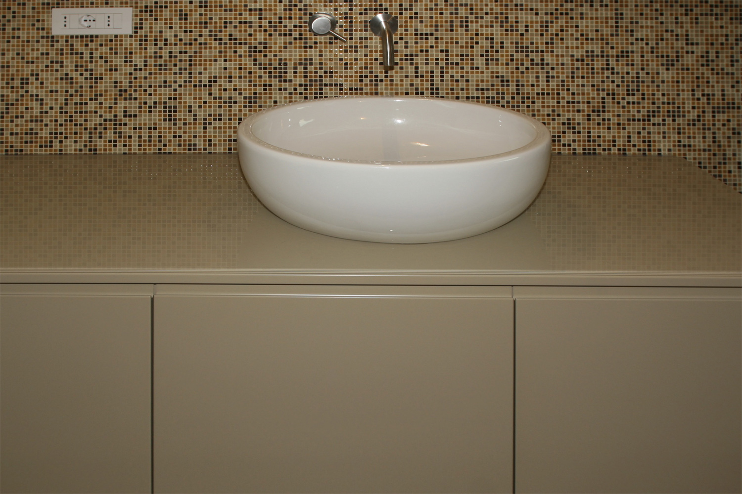 I tre bagni dell’abitazione sono connotati dall’utilizzo del mosaico vetroso; nel bagno della zona living, in cui ritroviamo pavimento e pareti in microcemento della medesima tonalità della cucina, il prezioso mosaico di “CasadolceCasa”, leggermente cangiante, conferisce una morbidezza molto accogliente. Gli arredi, sempre disegnati su misura ed i sanitari di NIC Design, rendono l’ambiente molto elegante e raffinato. I bagni della zona notte sono meno neutri e più caratterizzati in funzione dell’utenza. Il bagno privato della camera matrimoniale si sviluppa sempre sui toni dei marroni e dei beige, ma in modo più accentuato: il mosaico di Vitrex si abbina perfettamente con il pavimento in legno, con il rivestimento in lastre di Laminam della zona doccia e con il mobile lavabo realizzato su disegno. La rubinetteria in acciaio satinato è di Cea Design. Il terzo bagno, utilizzato dai due figli dei proprietari, è connotato dai toni del bianco e del grigio; la pavimentazione in ceramica bianca di Mutina fa da sfondo alla lunga base di appoggio del lavabo rivestita in mosaico di Mosaico+. La rubinetteria bianca è di Fantini.